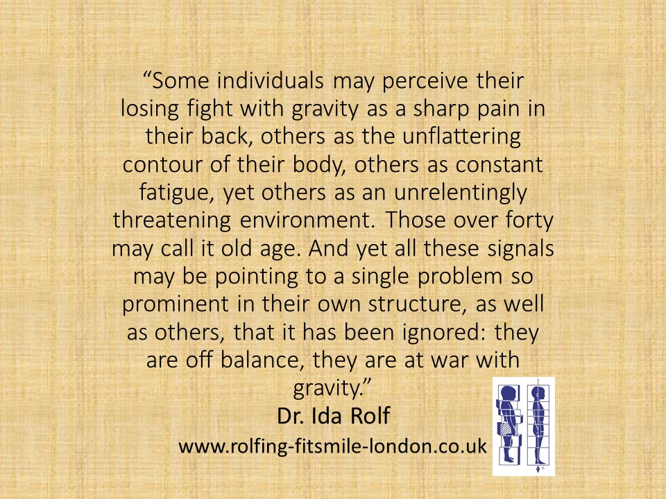 “Some individuals may perceive their losing fight with gravity as a sharp pain in their back, others as the unflattering contour of their body, others as constant fatigue, yet others as an unrelentingly threatening environment. Those over forty may call it old age. And yet all these signals may be pointing to a single problem so prominent in their own structure, as well as others, that it has been ignored: they are off balance, they are at war with gravity.”
