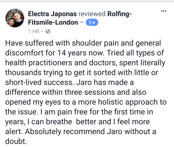 “Have suffered with shoulder pain and general discomfort for 14 years now. Tried all types of health practitioners and doctors, spent literally thousands trying to get it sorted with little or short-lived success. Jaro has made a difference within three sessions and also opened my eyes to a more holistic approach to the issue. I am pain free for the first time in years, I can breathe better and I feel more alert. Absolutely recommend Jaro without a doubt.” – Electra Japonas
